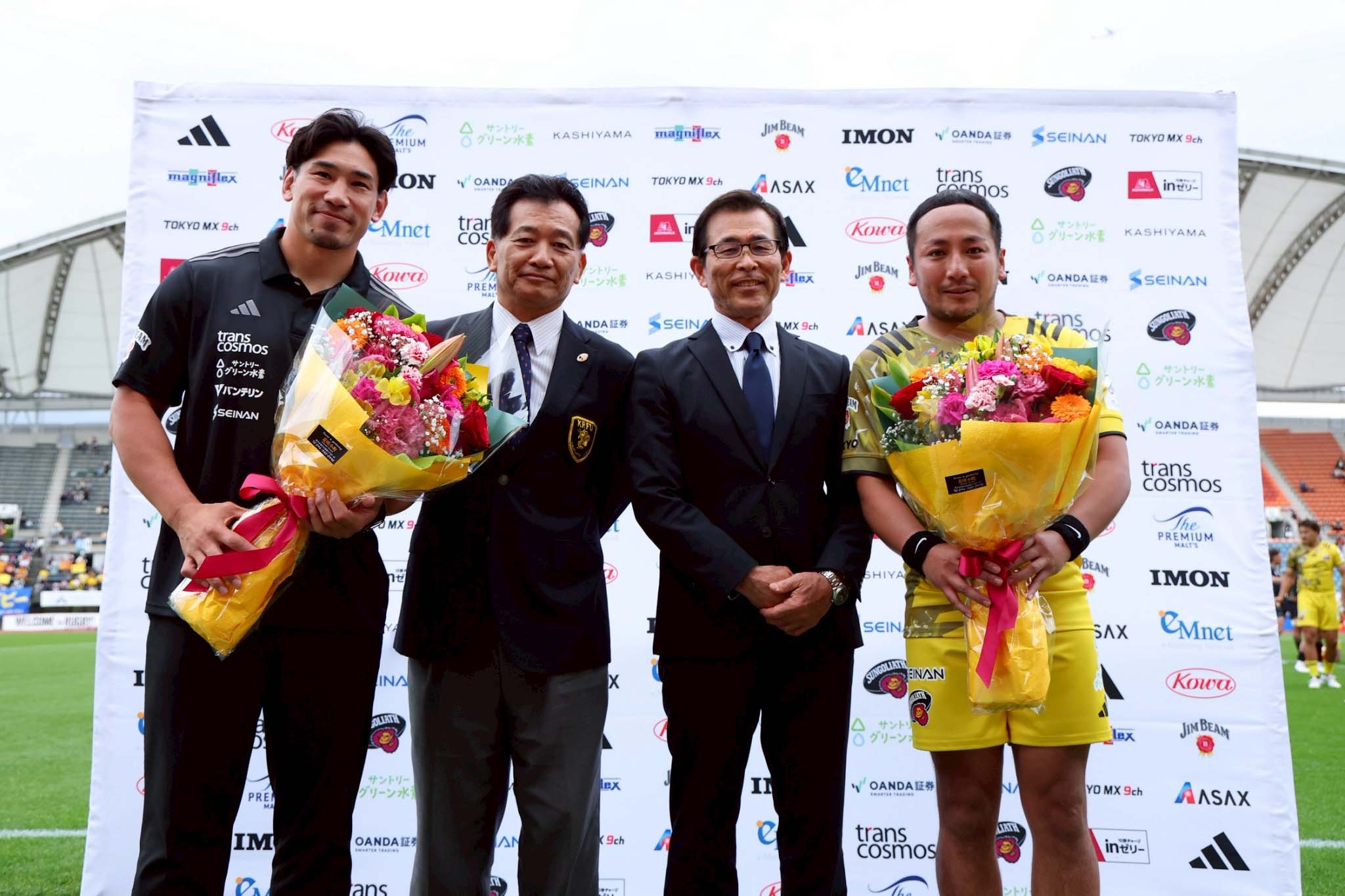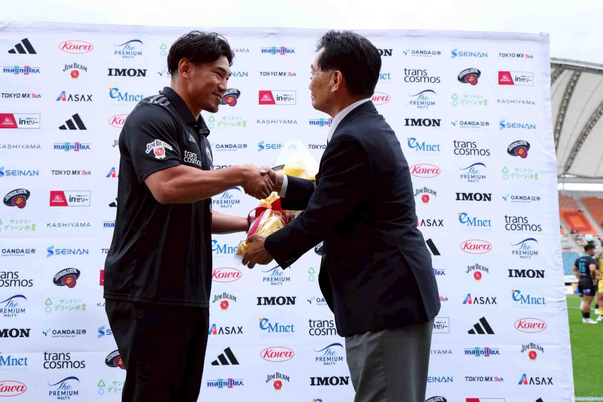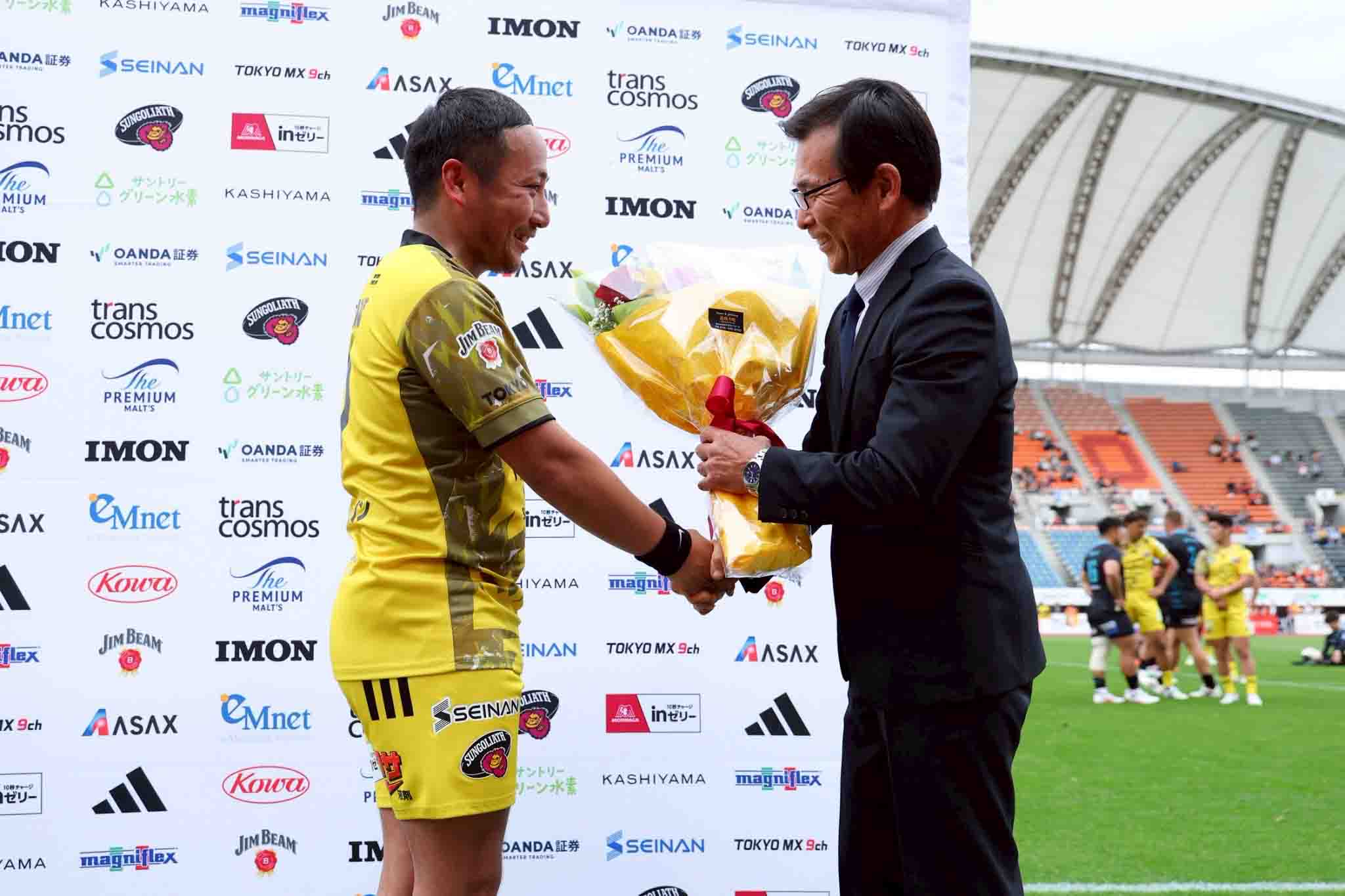 流大、中村亮土選手のセレモニーが4月18日、熊本・えがお健康スタジアムで行われました。両選手から挨拶があり、花束は両選手の高校時代の恩師から贈られました。